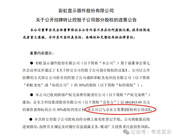 6月24日盘后,彩虹显示器件股份有限公司(以下简称 “彩虹股份”)发布《关于公开挂牌转让控股子公司部分股权的进展公告》,宣布已与京东方签署《股权转让协议》,京东方以约48.49亿元的价格获得彩虹股份所持控股子公司咸阳彩虹光电科技有限公司(以下简称 “彩虹光电”)30%的股权受让权。