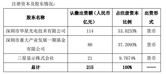 据披露,目标公司——深圳市华星光电半导体显示技术有限公司为中外合资公司,成立于2016年6月24日,目前正处于产线建设期,公司认缴出资额为215亿元,其中三星显示株式会社出资21亿元,占注册资本比例9.7674%。