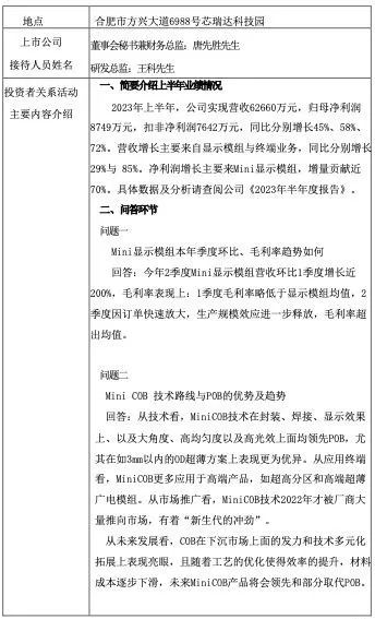 芯瑞达向投资者介绍了上半年业绩情况。2023年上半年,公司实现营收62660万元,归母净利润8749万元,扣非净利润7642万元,同比分别增长45%、58%、72%。营收增长主要来自显示模组与终端业务,同比分别增长29%与85%。净利润增长主要来Mini显示模组,增量贡献近70%。