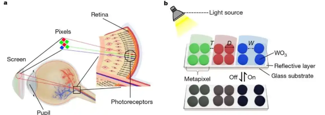 据了解,这项被命名为“视网膜电子纸”(retina E-paper)的制造工艺,通过电化学还原使三氧化钨纳米圆盘发生可逆的绝缘体-金属相变,从而在极小尺度上精确调控屏幕的反射率与对比度。由此制成的电子纸像素尺寸可小至560纳米,甚至小于某些细菌,像素密度超过每英寸25,000像素(PPI)。