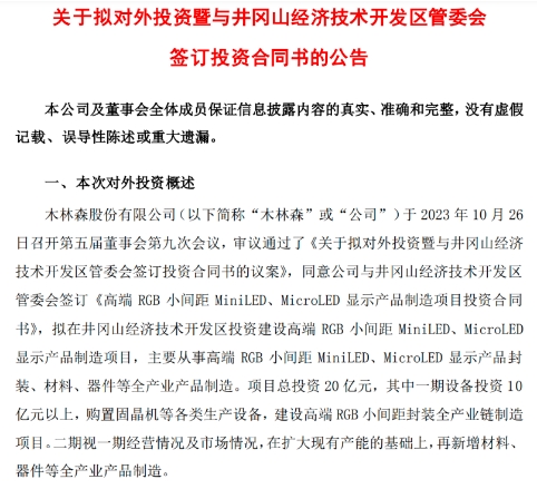 10月26日晚间,木林森(002745)公告称,公司董事会通过一项议案,同意公司与井冈山经开区管委会签订投资合同书,拟在井冈山经开区投资建设高端RGB小间距MiniLED、MicroLED显示产品制造项目,主要从事高端RGB小间距MiniLED、MicroLED显示产品封装、材料、器件等全产业产品制造。