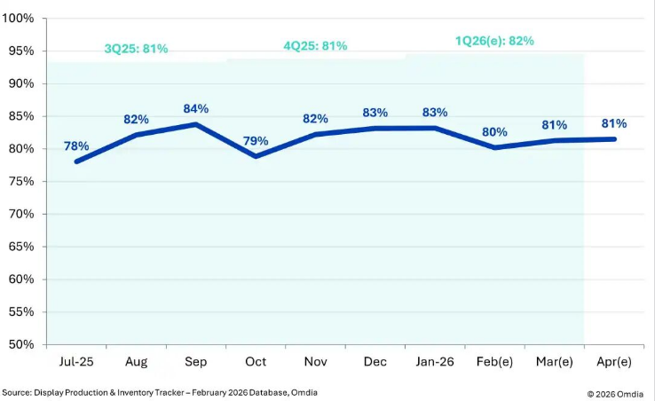 3月31日消息,据研究机构Omdia最新发布最新报告,2026年第一季度,显示面板企业连续二个月提高了玻璃投片率,预计将超过上一季度水平。机构预测,显示面板企业在2026年第一季度的玻璃投片率将达到82%,高于2025年第四季度的81%。