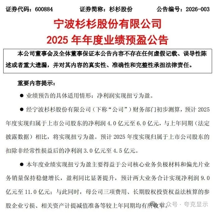 1月30日,杉杉股份(600884.SH)公布,经公司财务部门初步测算,预计2025年度实现归属于上市公司股东的净利润4.0亿元至6.0亿元,与上年同期(法定披露数据)相比,将实现扭亏为盈。预计2025年度实现归属于上市公司股东的扣除非经常性损益后的净利润3.0亿元至4.5亿元。