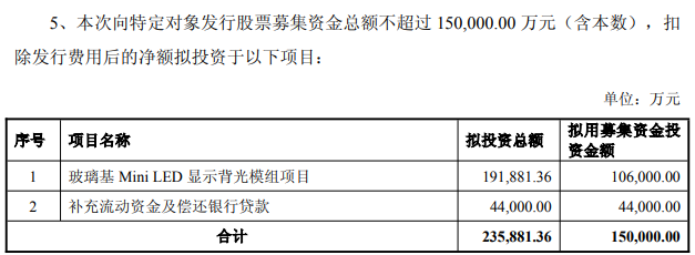5月30日,沃格光电(603773.SH)公布2025年度向特定对象发行A股股票预案,本次向特定对象发行股票募集资金总额不超过15亿元(含本数),扣除发行费用后的净额拟投资于以下项目:玻璃基MiniLED显示背光模组项目、补充流动资金及偿还银行贷款。