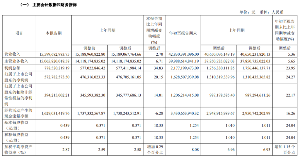 其中,第三季度实现营业收入156亿元,同比增长2.70%;归属于上市公司股东的净利润5.73亿元,同比增长20.15%;基本每股收益0.439元。