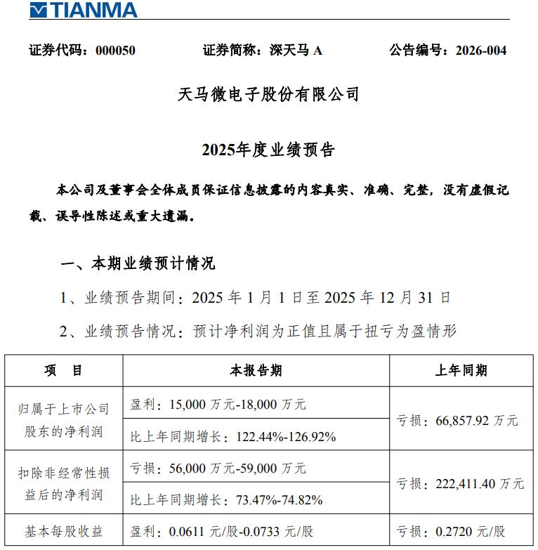 1月29日,深天马A(000050)发布公告,预计2025年度归母净利润为1.5亿元至1.8亿元,较上年同期亏损6.69亿元实现扭亏为盈,增幅约为122.44%至126.92%。