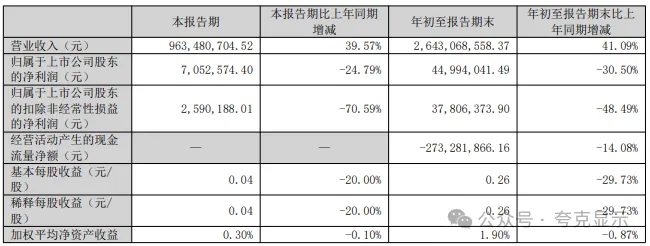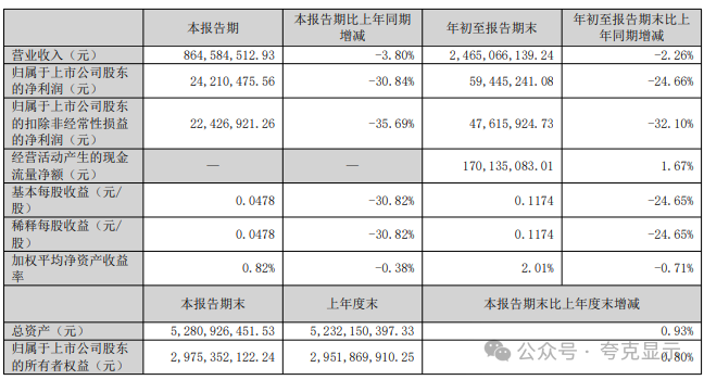 其中,第三季度,公司营业收入为8.65亿元,同比下降3.80%;归母净利润为2421.05万元,同比下降30.84%;扣非归母净利润为2242.69万元,同比下降35.69%。