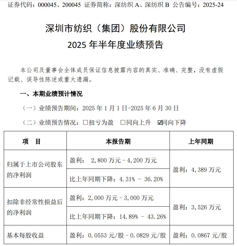 深纺织A(000045)7月10日晚间披露业绩预告,公司预计2025年上半年实现归属于上市公司股东的净利润为2800万元—4200万元,同比下降4.31%—36.2%。