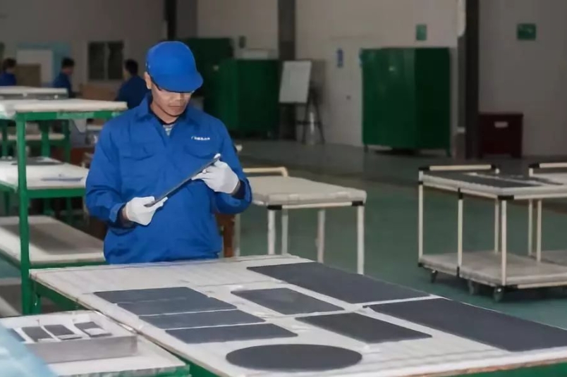 ITO靶材外形很像瓷砖,由来却远比瓷砖煅烧复杂得多——人们把氧化铟和氧化锡粉末按严格的比例混合后,经过一系列生产工艺加工成地板砖的形状,再层层摞叠到一个特制的炉子里,经过1700摄氏度高温气氛烧结,形成黑灰色的陶瓷半导体。通常靶材尺寸越大,溅射到平板上的拼缝就越少,价值也越高。