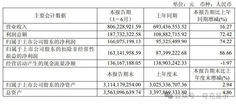 其中第二季度,公司营业收入为4.62亿元,同比上升26.5%;归母净利润为1.2亿元,同比上升97.5%;扣非归母净利润为1.21亿元,同比上升117.5%;EPS为0.6939元。