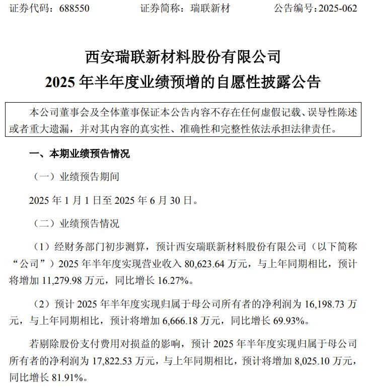 7月9日晚间,瑞联新材(688550)披露业绩预告,公司预计2025年上半年实现营业收入8.06亿元,同比增长16.27%。预计2025年上半年实现归属于母公司所有者的净利润为1.62亿元,同比增长69.93%。