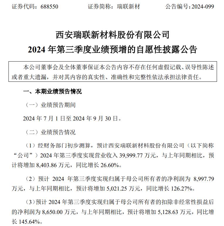 (1)经财务部门初步测算,预计西安瑞联新材料股份有限公司(以下简称“公司”)2024 年第三季度实现营业收入 39,999.77 万元,与上年同期相比,预计将增加 8,403.86 万元,同比增长 26.60%。