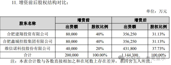 公告显示,合肥维信诺电子的前身是维信诺于2022年联合合肥东欣投资有限公司(简称“合肥东欣”)、合肥鑫城控股集团有限公司(简称“合肥鑫城”)共同设立的项目公司,用于实施总投资110亿元第6代柔性有源矩阵有机发光显示器件(AMOLED)模组生产线项目。根据初始协议,项目注册资本55亿元,维信诺与合肥东欣各出资25亿元(股权占比45.4545%),合肥鑫城出资5亿元(股权占比9.0910%)。