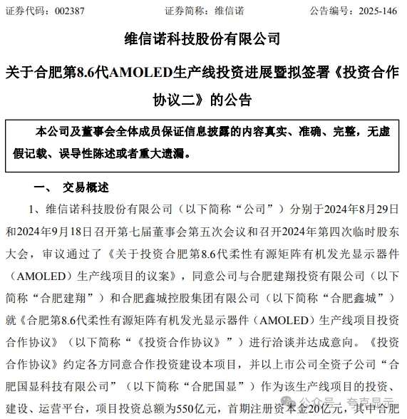该事项已获维信诺第七届董事会第二十九次会议全票通过(7票同意、0票反对、0票弃权),无需提交股东大会审议。公告同时强调,此次交易不构成关联交易,亦不构成《上市公司重大资产重组管理办法》规定的重大资产重组。