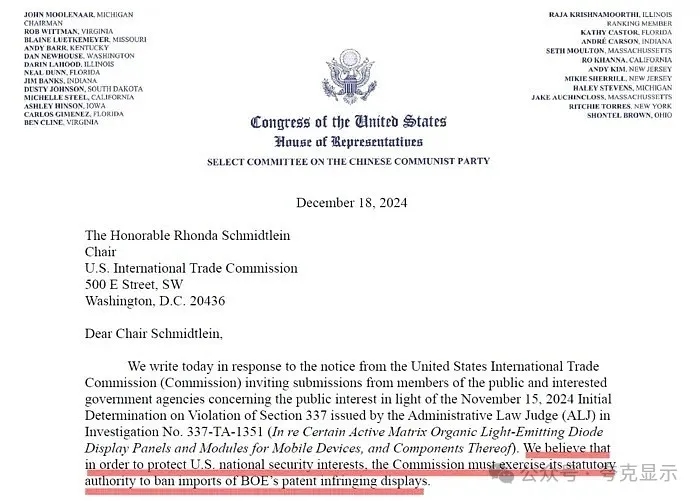12月18日,约翰·穆勒纳尔18日(当地时间)再次致信美国国际贸易委员会(USITC),信中再次呼吁禁止进口京东方显示器。