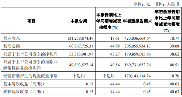 其中第三季度,公司营业收入为1.31亿元,同比上升18.6%;归母净利润为5339万元,同比上升43.3%;扣非归母净利润为4989万元,同比上升49.5%;EPS为0.1327元。