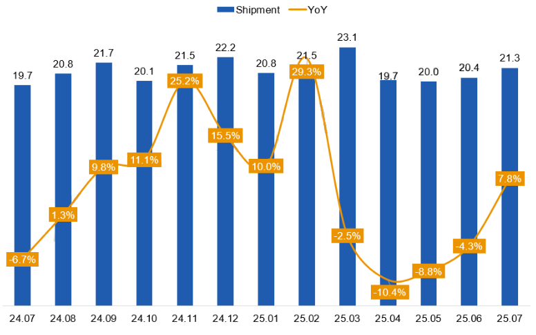 24.07-25.07全球电视面板出货情况及同比变化