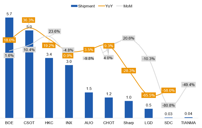 面板厂出货方面:除日韩系面板厂外,其他面板厂出货量同比均呈增长趋势,陆系面板厂出货同比强劲增长,台系面板厂出货同比温和增长。