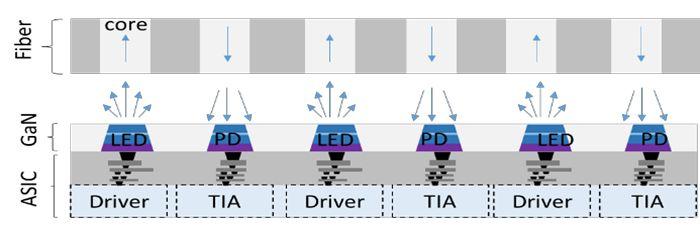 LED 阵列使用InGaN / GaN微型发光二极管,可以实现大规模并行传输,从而达到高数据速率密度。
