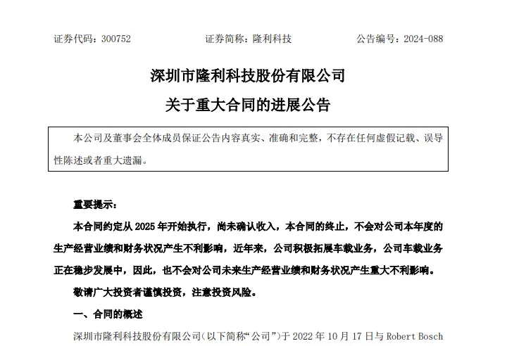 在此之前,隆利科技与德国博世未曾有过此类交易,此次合作属首次。彼时,隆利科技宣称,本次合同的签订将进一步凸显公司车载Mini-LED背光显示模组技术在汽车行业的优势地位,加速公司向国际汽车市场的开拓。