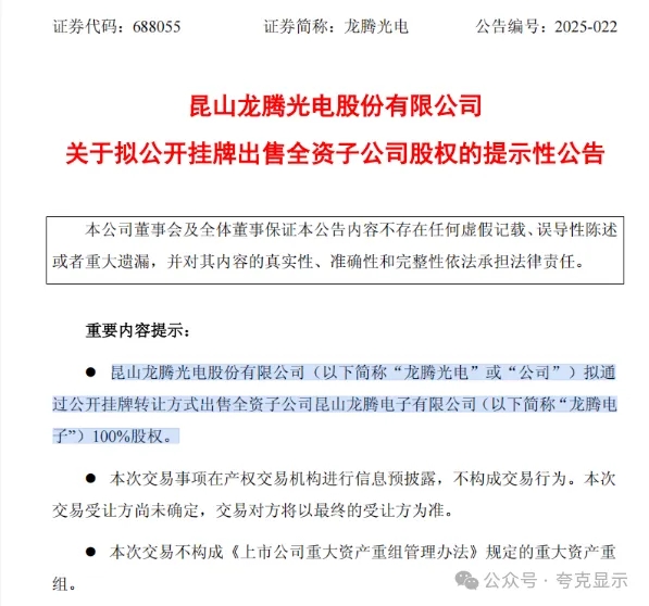 龙腾光电11月4日公告,因应公司全球战略发展规划,优化资源配置并推进新质生产力领域布局,提高整体运营效率,公司拟通过公开挂牌转让方式出售全资子公司龙腾电子100%股权。