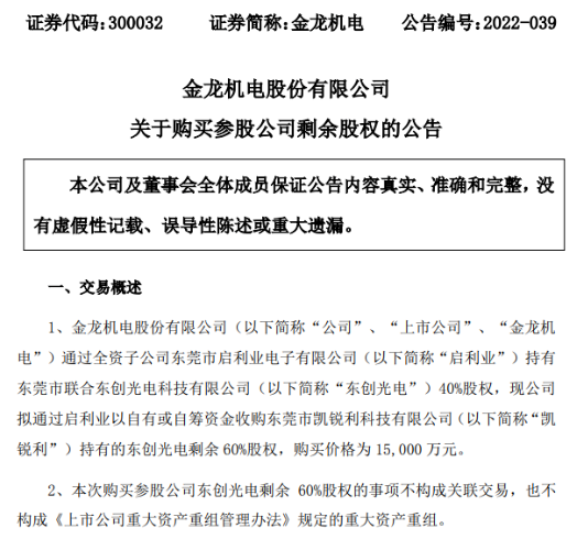 7月5日,金龙机电公告,公司通过全资子公司东莞市启利业电子有限公司(简称“启利业”)持有东莞市联合东创光电科技有限公司(简称“东创光电”)40%股权,拟通过启利业以自有或自筹资金收购东莞市凯锐利科技有限公司(简称“凯锐利”)持有的东创光电剩余60%股权,购买价格为1.5亿元。截至目前,东创光电未开展具体的生产活动。