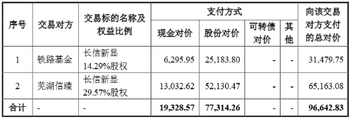 为满足市场对相关业务板块产能增加的需求,加快高端显示业务研发进度,从而实现快速量产,长信科技投资并设立了长信新显。长信新显自成立以来项目建设进展顺利,市场开拓情况良好,已步入了持续、健康发展的良性轨道。本次交易,长信科技向交易对方中的铁路基金支付现金对价6,295.95万元,向交易对方中的芜湖信臻支付现金对价13,032.62万元,合计19,328.57万元。
