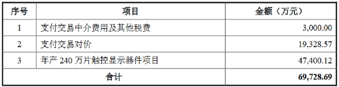 长信科技拟募集配套资金总额不超过69,728.69万元,其中19,328.57万元用于支付交易中介费用及其他税费,3000万元用于用于支付本次交易的现金对价,47400.12万元投入长信新显项目建设。