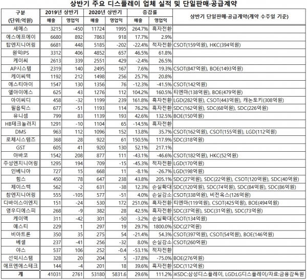 与此同时。韩国最大的半导体和显示设备制造商Semes在2020年上半年实现了68.8亿元的销售额。其营业利润为11.7亿元。然而,显示设备仅占销售额的5.2%,达到3.54亿元。