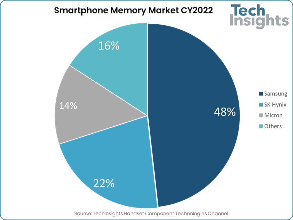 就市场份额而言,三星在2022年智能手机 DRAM 市场的收入份额为55%,其次是SK 海力士 (23%) 和美光 (21%)。
