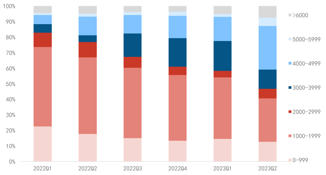 2022-2023Q2 中国学习平板线上市场分价格段结构