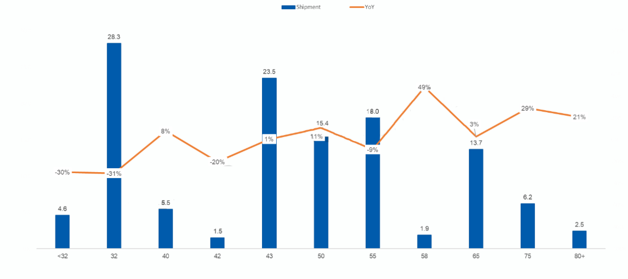 从这份表单中,可以明显看到,55寸及以下中小尺寸出货量萎缩已成“大势”。而55寸以上大屏电视则是全面走高。其中,在市场需求倾向大尺寸的影响下,尤其75/80+寸更是大幅增长,极大的拉动了上半年TV面板平均出货尺寸的再度上升。