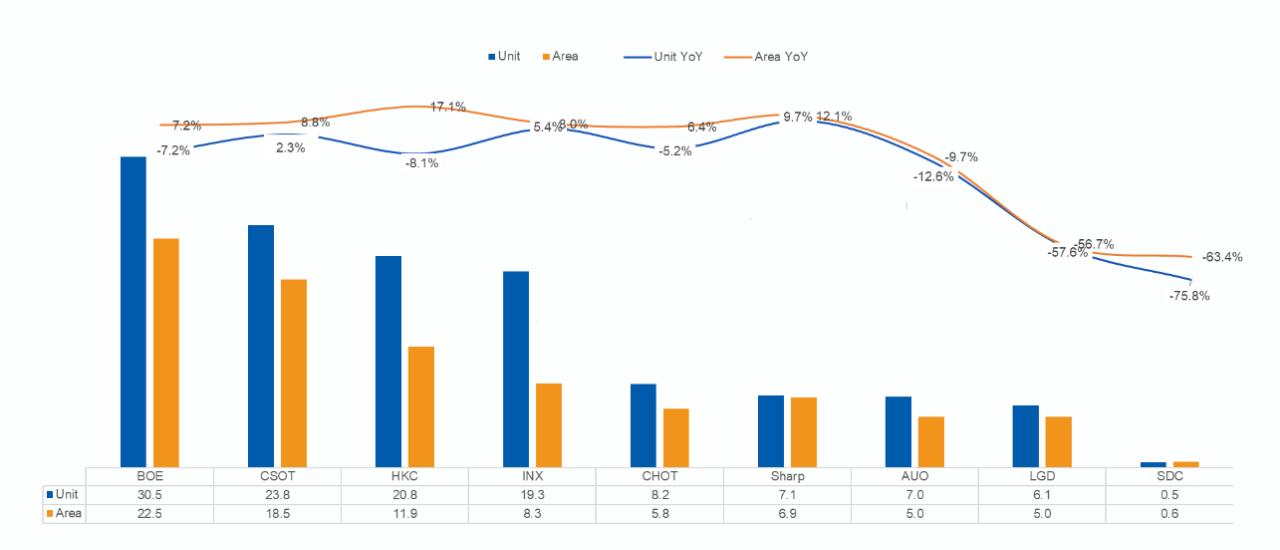 不过,虽然TOP3名次未变,但在走势却有一些“变化”。其中京东方和惠科由于整体环境需求不振,造成出货量在同比在下滑,但是出货面积在同比上升。而华星光电则是上半年是TOP3品牌中既能做到出货量和出货面都双双增加的品牌。