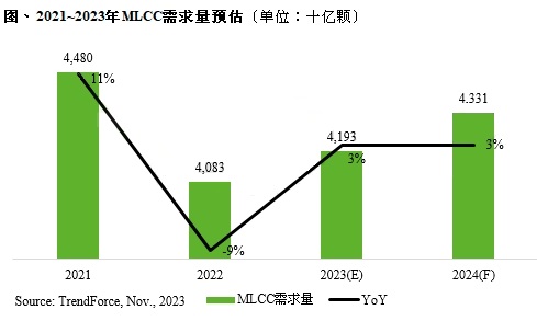 11月15日消息,据TrendForce集邦咨询表示,2023~2024年MLCC市场需求进入低速成长期,产业成长空间有限,2023全年MLCC需求量预估约41930亿颗,年增率仅约3%,主要应用市场是智能手机、车用、PC等。由于全球经济环境充满变量,OEM及ODM均保守看待市况,预估2024年MLCC需求量将微幅上升3%,约43310亿颗。