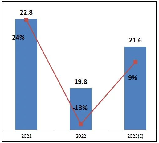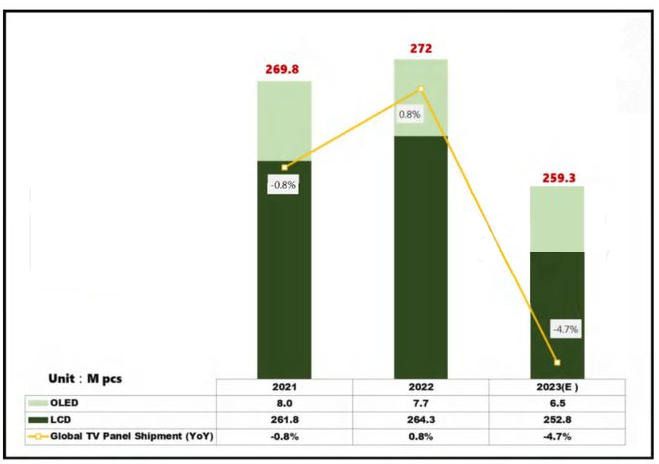 图五、2021~2023年全球电视面板出货量预测 图片来源:TrendForce