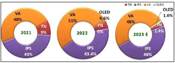 图三、2021~2023年电竞显示器面板类型市占率 图片来源:TrendForce