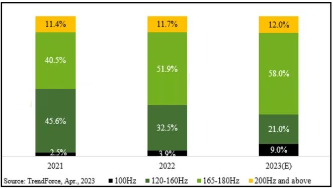 图四、2021~2023年电竞产品刷新率市占率 图片来源:TrendForce