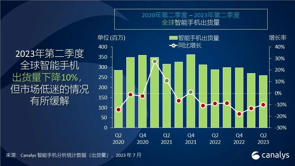 研究机构Canalys发布统计数据,显示2023年第二季度,全球智能手机出货量同比下降10%,达到2.58万亿部,市场衰退有所放缓。