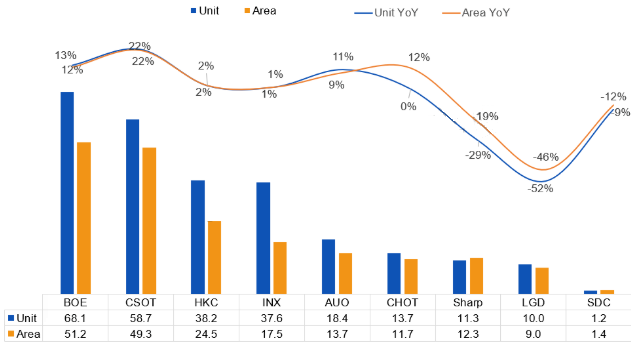 CHOT(彩虹光电):全年出货13.7M,同比增长12%,出货面积11.7M㎡,同比持平,市占率5%。尺寸结构上,聚焦大尺寸化,缩减32/50寸等小尺寸产能,扩大55寸出货至1M。客户以海信/TCL等国内品牌为主,与三星电子有少量合作。