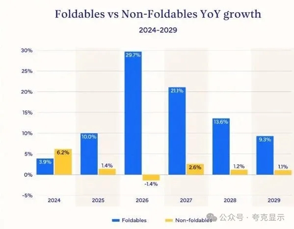 随着消费者使用智能手机的时间越来越长,供应商越来越难以延长更换周期。可折叠,甚至是三折叠,对于一个已经趋于稳定,需要有意义的创新来激励升级和推动价值的行业来说,正变得至关重要。预计到2029年,可折叠智能手机的复合年增长率将达到17%,而传统智能手机的复合年增长率不到1%。