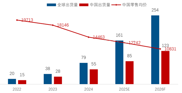 中国泛百寸电视零售均价从2022年的19713元逐年下降,2024年降至14463元,2025年上半年更是降至12941元,2026年有望进一步下探至11000元以下。