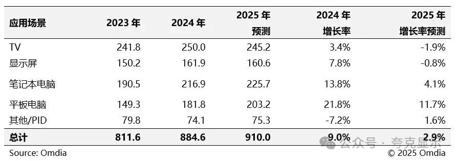7月25日,市调机构Omdia在报告中指出,2025年大尺寸显示屏(9英寸及以上)的出货量预计将同比增长2.9%。尽管2025年的增长预期低于2024年,但这一增长是在全球经济不确定性以及对美国关税存在担忧的背景下实现的。值得注意的是,电视和显示屏应用的出货量在2025年预计将出现负增长。