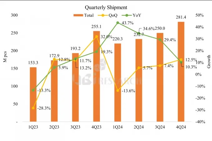 2024年业绩数据显示,韩国和中国的大部分面板厂商的出货量均增加了4000万至5000万片,特别是中国面板厂商TCL CSOT、天马、维信诺和和辉的出货量较2023年增长了超过50%。