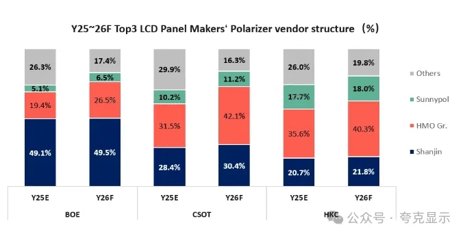 2025年LCD面板用偏光片需求中杉金光电占比接近50%,预计2026年将维持约五成的份额。在偏光片供应方面,京东方得到杉金光电的最优保障,以及产品研发方面的高度协同,共同开发了STW高端面板用偏光片,对京东方的高端品形成了加持和保障。随着恒美与SDI业务交割完成,预计2026年恒美集团在京东方内部的偏光片占比也将进一步提升到超20%的水平,成为京东方LCD面板用偏光片的第二大供应商。头部两家偏光片厂商供应份额超七成,偏光片供应走向更集中。