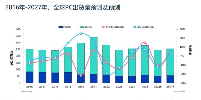 Omdia最新预测,2026年全球台式机、笔记本及工作站出货量预计下降12%,至2.45亿台。这一预测基于内存与存储价格的急剧上涨——特别是预计2026年第一季度将至少上涨60%。预计全年剩余季度仍将面临进一步的价格上涨压力,但后续涨幅可能更加温和。