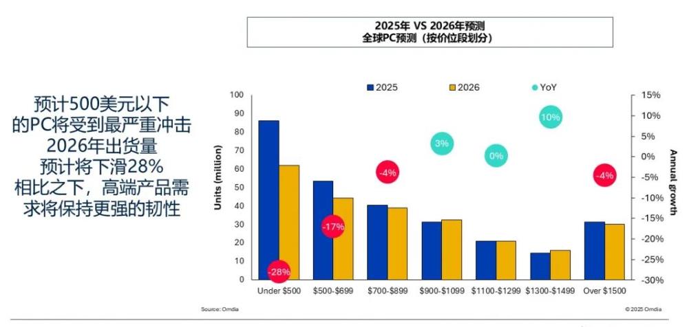 预计2026年,售价低于500美元的PC出货量受冲击最严重,下降约28%,至约6210万台。相比之下,售价900美元及以上的高端PC较具支撑,出货量甚至可能保持小幅增长。叶茂盛补充道:“高价产品不仅更能吸收成本上涨,部分消费者和IT决策者为了满足必要需求也愿意接受更高价格,从而推动价格结构上移。但价格上移并不意味着产品配置更优。”