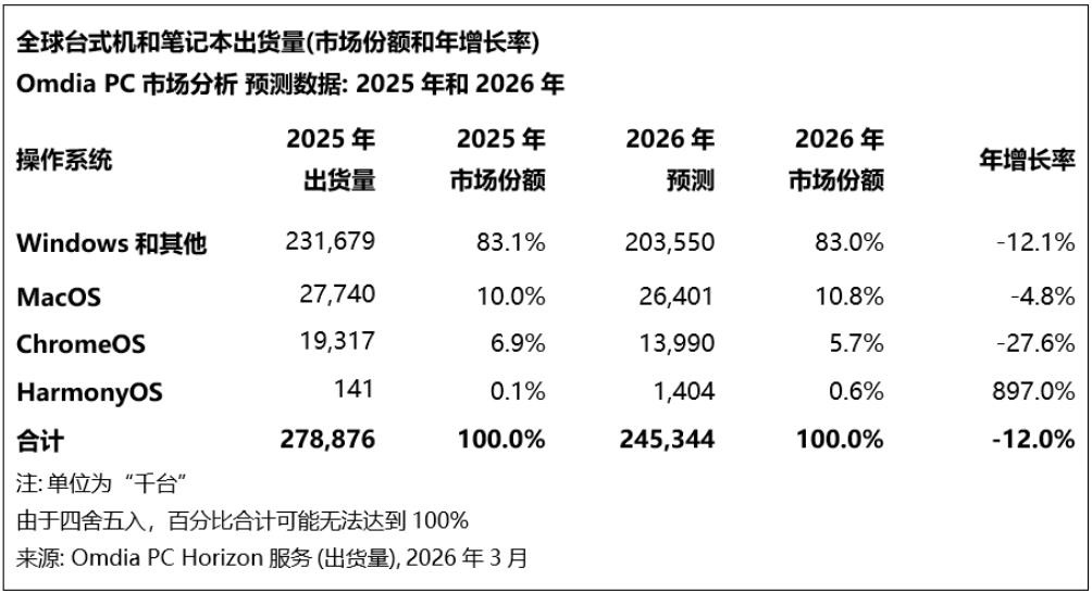 Omdia研究经理Kieren Jessop表示: “2026年的供应驱动型下行不会均等影响所有PC平台。Windows PC占全球出货量的83%,预计2026年下降12%,因其承受了内存与存储供应紧张的主要冲击。Chrome设备受影响最为严重,预计下降28%,由于该教育为主的平台特别容易受到组件分配紧张、利润率较低以及部分内存和存储产品停产的影响。Mac预计下降幅度相对温和,为5%,受益于苹果垂直整合的供应链和高端定位。与此同时,基于HarmonyOS的PC正在成为值得关注的增长细分市场,预计将在小基数上实现同比增长十倍,随着华为在中国加快其PC生态布局,这一趋势将持续显现。”