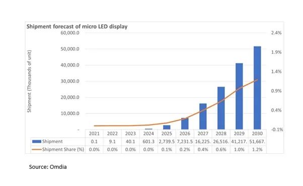 9月19日,市调机构Omdia在报告中指出,到2030年,微型发光二极管(Micro LED)显示面板的出货量预计将增长到5170万台。然而,在预测期内,由于该技术仅在有限的应用中具有竞争力,Micro LED显示面板的出货量份额将仅占整个显示器市场的1.2%左右。