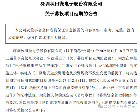 12月18日晚间,秋田微(300939)公告,公司董事会同意将“电子纸模组产品生产线项目”“研发中心建设项目”及“深圳产业基地”三个募投项目达到预定可使用状态的日期由2025年12月31日调整为2027年12月31日。