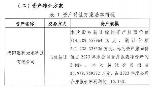 此次出售的绵阳惠科光电科技有限公司股权账面价值为21.43亿,转让价格为24.12亿,转让损益为2.69亿,占绵阳投资2023年度公司合并报表净利润的115.14%。